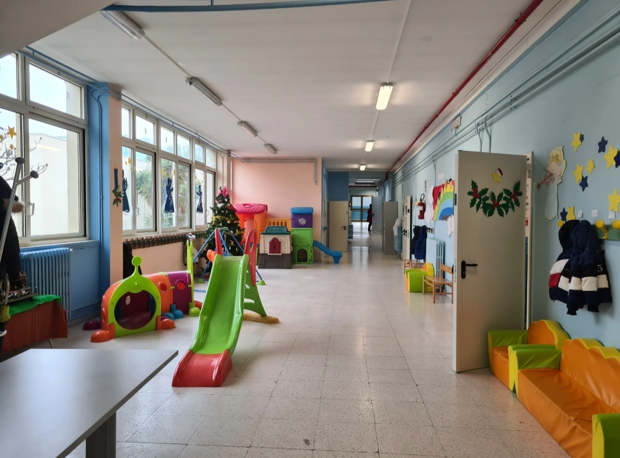 Il piano terra ospita classi di Scuola Primaria nell’ala di sinistra e sezioni di Scuola dell’Infanzia nell’ala di destra.