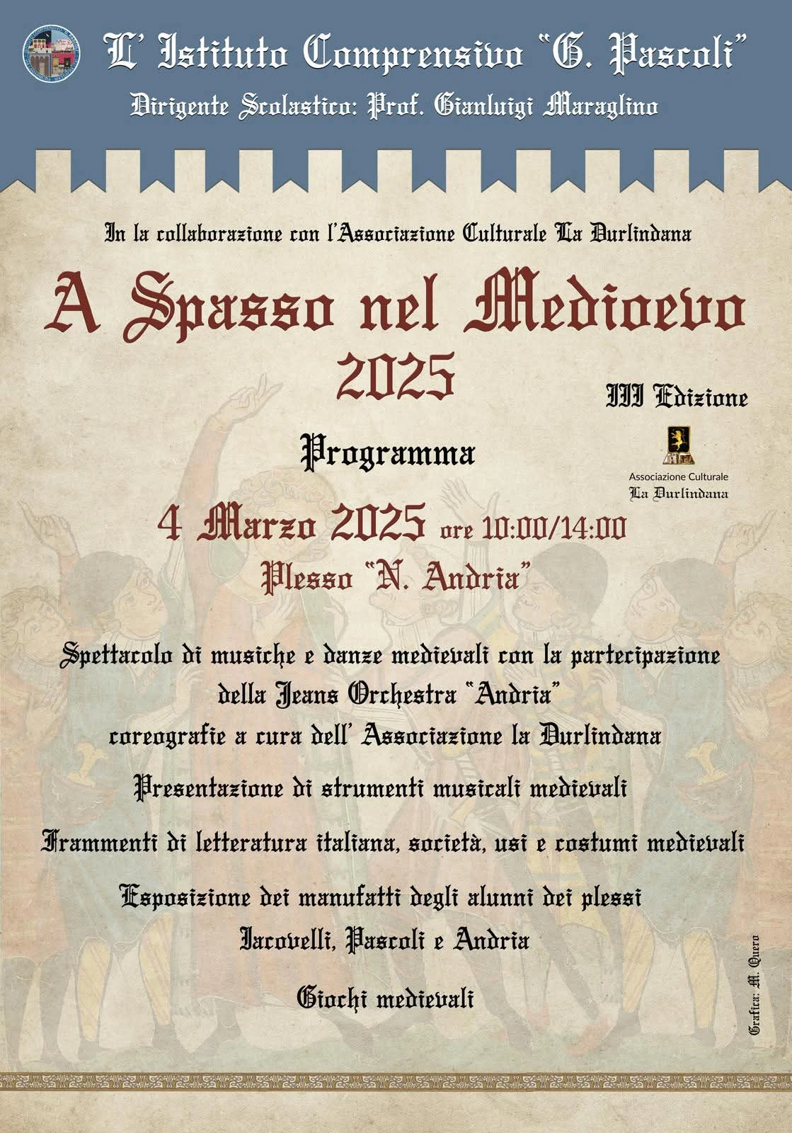 Un viaggio nel tempo che ha unito storia, musica e danza, regalando a tutti un’esperienza immersiva e coinvolgente. Grazie al DS Gianluigi Maraglino, allo staff dirigenziale, alle ideatrici e referenti del progetto, Giusi Larucci e Titti Dell'Orco, alla prof.ssa Milena Quero per la grafica del manifesto, ai docenti del corso musicale per gli arrangiamento originali, alla Durlindana per la realizzazione di scudi e spade con materiale di riciclo e per l'allestimento della fiera medievale, ai docenti Mattia Toma e Davide Licata per i giochi medievali; un ringraziamento alle maestre delle quarte e delle quinte della scuola primaria e a tutti coloro che hanno reso possibile questa terza edizione!